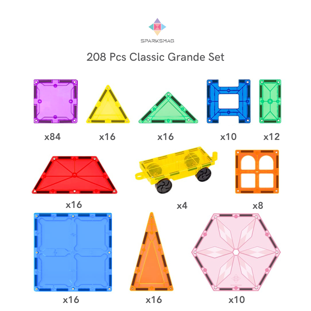 Unleash your child's creativity and watch their imagination soar with the SparksMag's largest set : 208 Pcs Grande Set. This is our ultimate expression of wonder, a universe of 208 vibrant pieces that invites your little ones to explore, design, and discover without bounds.